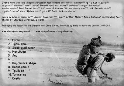 Gosha Hniu: cries and whispers, percussion, toys cymbals and objects, ac.guitar1,2,5,10 / Ig Yu Kun: el.guitar1,5,8,9, ac.guitar3,4,7,9, cl.guitar4,7, bass4,9, chorus9 / Timurti: hang5, sax2, flutes3,10, berimbau7,10, vargan10, harmonica3, wooden ocarina3 / Paul Turrel: bass1,10,11, kit2, piano8 / Guillaume Viltard: double bass1,3,7,8 / Uri Eichelmann: viola1,7,9, cl.guitar9, chorus9 / Yura Stolov: bass2,5, guitar-9511 / Seth Jackson: chorus4.