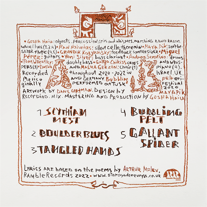 Gosha Hniu: objects, percussion, cries and whispers, marching band kazoo, wheel lyre1,2,4 / Ran Nahmias: silent cello, theremin / Maya Pik: synthesizer, flute4,5 / Grundik Kasyansky: feedback synthesizer / Miguel Pérez: guitars / Yoni Silver: bass clarinet / Andrea Serafino: drums / Tom Wheatley: double bass / Galya Chikiss: cries and whispers3 / Dasha and Masha Gerzon: choir1, piano4.