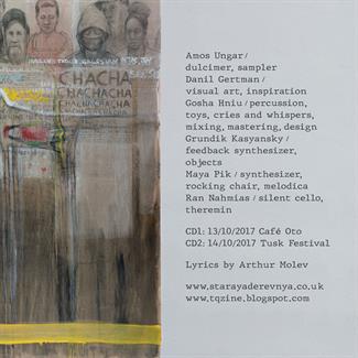 Amos Ungar: dulcimer, sampler / Danil Gertman: digital drawing / Gosha Hniu: percussion, toys, cries and whispers / Grundik Kasyansky: feedback synthesizer, objects / Maya Pik: synthesizer, rocking chair, melodica / Ran Nahmias: silent cello, theremin.